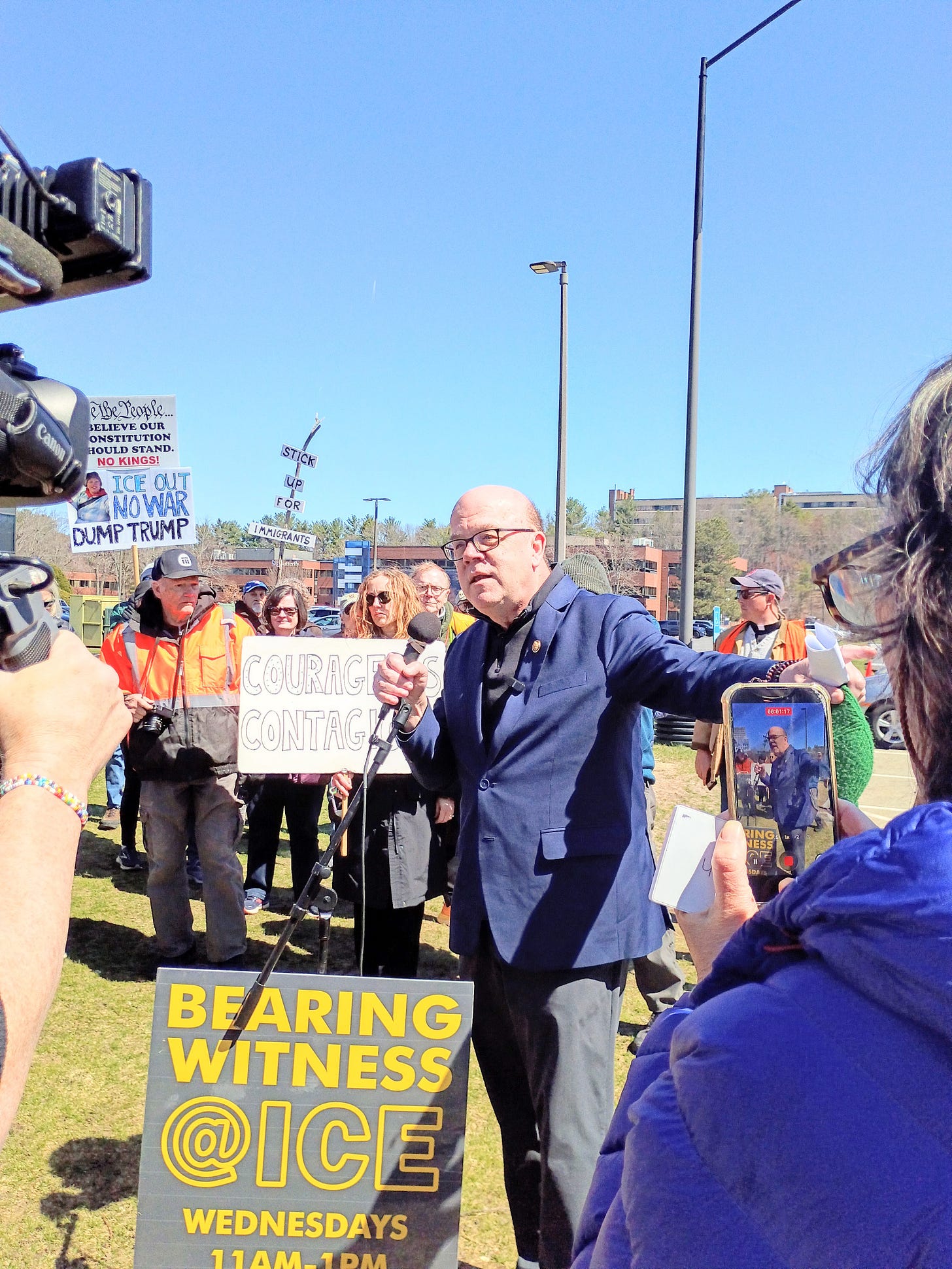 This time, they did let McGovern in. He confirmed that what he saw was a jail. He also had the opportunity to speak to a young man from Honduras–not “the worst of the worst” but someone who had a job, paid taxes, and had no criminal record and an asylum claim in process. This man has now been separated from his wife and two children–ages 12 and 7, with his future in limbo. McGovern’s visit is covered in this short news story. His recount of his observations to the people attending the weekly Wednesday witness in Burlington is here.